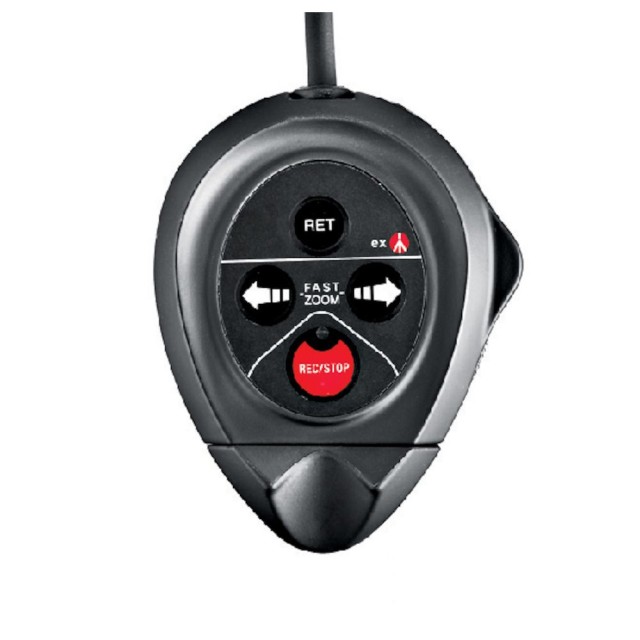 The Manfrotto MVR901ECEX Clamp-On Remote Control provides professional-grade camera control for Sony PMW EX-family cameras. Designed for rig applications, this remote allows precise operation with features such as REC/STOP push button, zoom direction switch, multi-speed zoom knob, max-speed zoom potentiometer, and RET push button to review the last 5 seconds of footage. The REC indicator LED keeps you informed of recording status, while fast zoom push buttons allow rapid adjustments during shooting. Its clamp-on design supports multiple pan bar diameters, making it flexible and adaptable to different rig configurations. Constructed from durable technopolymer, the MVR901ECEX ensures reliability in demanding environments while remaining lightweight at just 0.12 kg.
