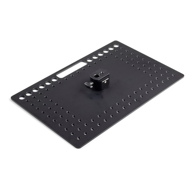 Taking influence from cinema and grip industry cheese plate style accessories, it features an array of 3/8” threaded mounting holes in key locations, which enables laptops of any size to be safely secured in place using the included anti-slip mounting hardware. The hole configuration also incorporates a useful cable management feature to prevent the disconnection of cables from the device should the user accidentally pull them during the shoot.