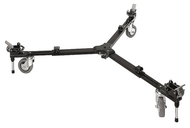 The Manfrotto 127VS is the professional variable-spread dolly for light and medium-weight tripods, accepting both standard rubber feet and spiked feet. With individually adjustable leg arms, a sure-lock lever that lifts all three wheels clear of the floor for rock-solid static positioning and smooth wheels with individual brakes, it’s the classic studio/video dolly that gives perfect stability on uneven floors while allowing fast, precise repositioning.
