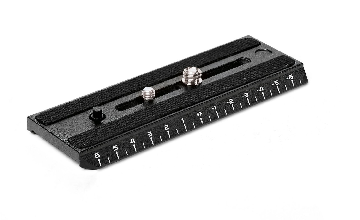 Sliding camera plate (140mm long) with metric ruler compatible with Manfrotto fluid video heads: MVH502AH, MVH502A, 504HD, 509HD, MVHN8AH and MVHN12AH.