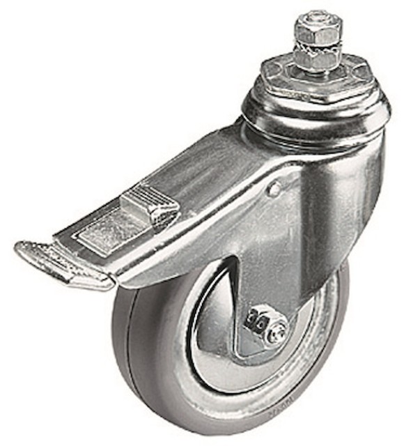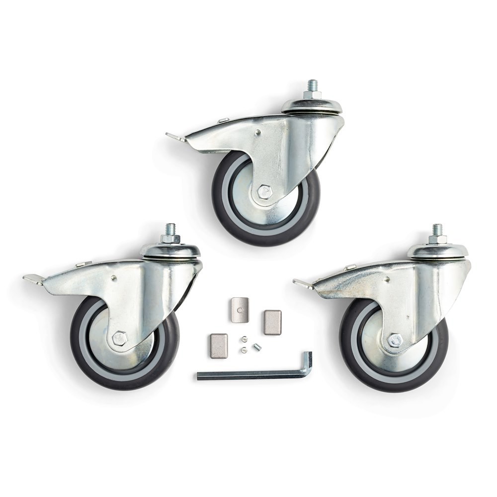 The Manfrotto 104G is a set of three 100 mm braked wheels with M10 threaded studs, supporting 100 kg total payload—delivering smooth, lockable rolling for most M10-threaded stands (e.g., 087NW, 475B, 269HDB) in a robust 3 kg studio dolly kit.