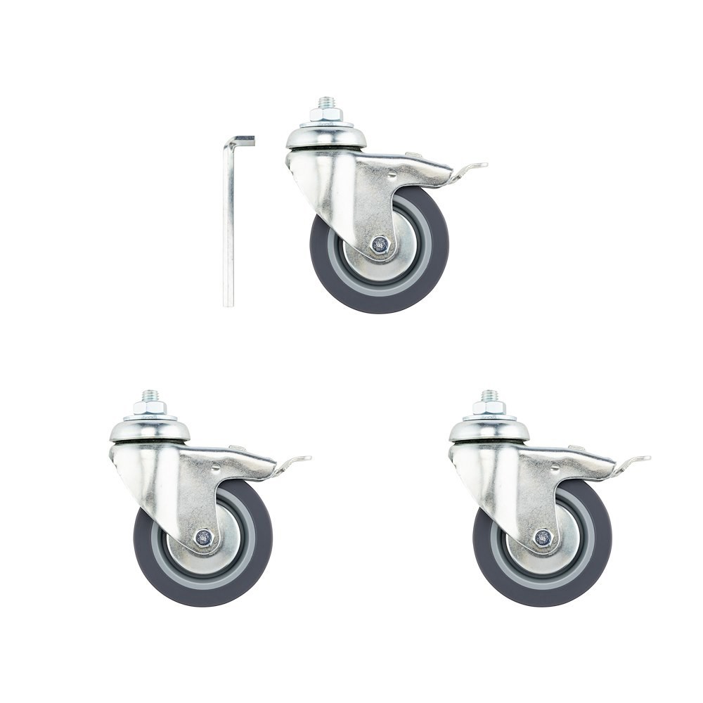 Upgrade any M10-equipped Manfrotto stand with the 104 Wheel Set: three rugged 75 mm polyurethane wheels with independent step-on brakes for instant lock and release. Each wheel threads securely via a steel M10 stud and lock nut, distributing weight evenly across a 75 kg payload.