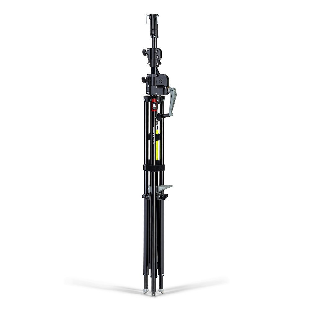 The Manfrotto 087NWB Wind Up Photo Stand is an essential tool for professional photographers and filmmakers who require maximum strength, precision, and reliability. Built from durable black chrome steel, this heavy-duty stand is engineered to handle large lighting fixtures, cameras, and accessories with ease. Featuring a geared wind-up column with three sections and two risers, it allows smooth and controlled height adjustments up to an impressive 370 cm, making it ideal for high-angle lighting and overhead setups.