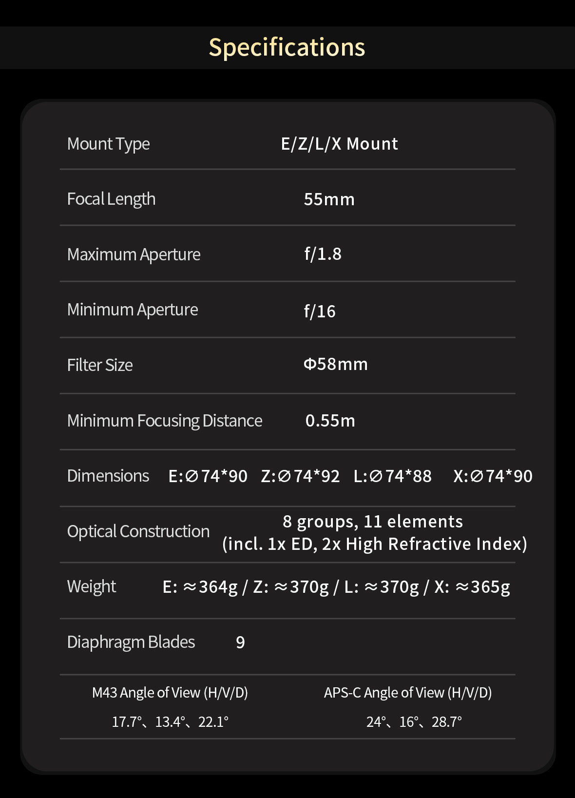 | Focal length | 55mm |