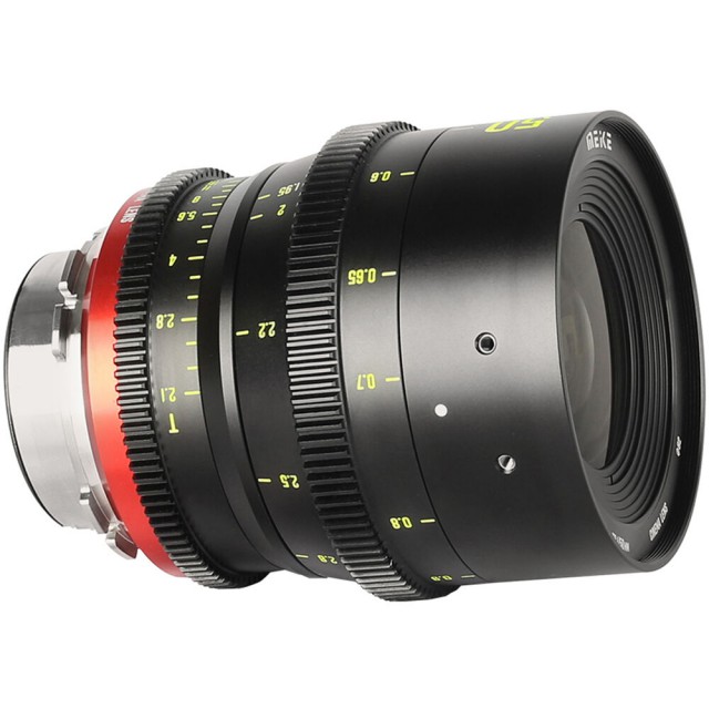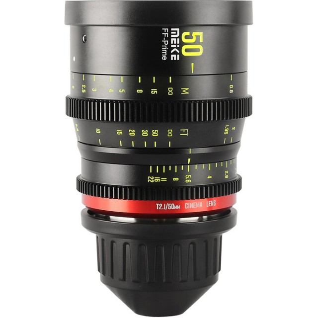 Meike 50mm T2.1 lens from the FF-Prime Cine Series. With an image circle of 45 mm, this lens is compatible with Full Frame cameras, and is available in various lens mounts, including PL/EF/RF/E/L/Z. It has industry-standard 0.8mm pitch gears on the focus and aperture rings. The lens design of the Meike 50mm T2.1 FF-Prime consists of twelve elements in eight groups, and an aperture mechanism consisting of 11 aperture blades. The minimum focusing distance is 60mm. Compatible with Canon C700, Sony VENICE, Alexa LF, Z Cam E2-F6, Mavo LF, all full-frame Sony, Panasonic, Canon, Sigma, and Leica mirrorless camera, all Super 35/ APS-C sensors.