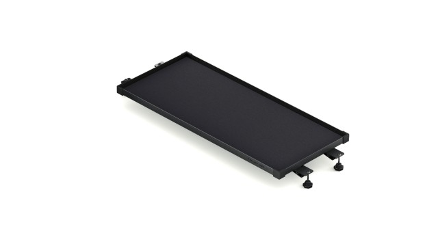 When positioned higher, the tray functions as a slim, convenient shelf—perfect for storing tools, batteries, cables, or smaller components—while preserving ample open space below for larger cases and equipment. Constructed from high-strength aluminum alloy and finished in a sleek black coating, the tray is lightweight yet rugged enough for demanding production environments.
