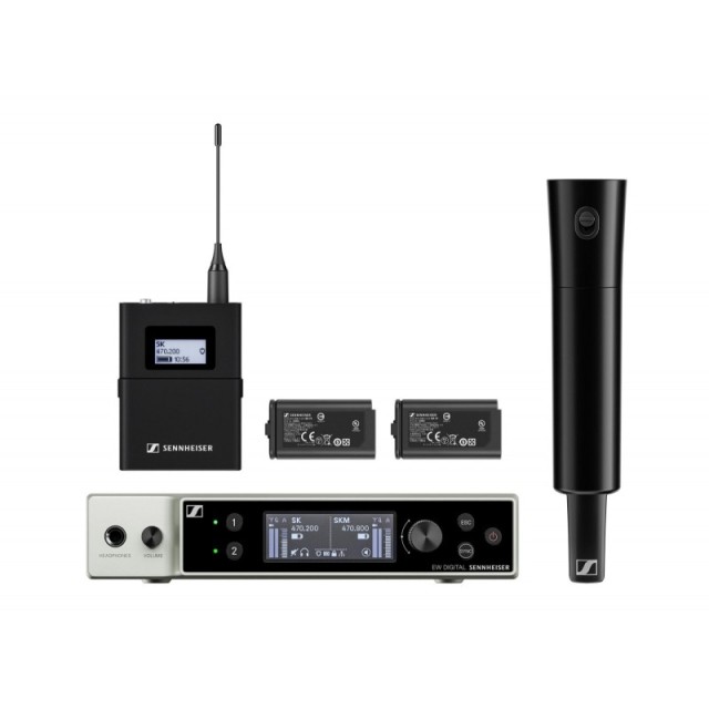 The Sennheiser ew-DX SK/SKM is a high-quality, dual digital wireless microphone system designed for professional use. It combines a handheld transmitter (SKM) and a bodypack transmitter (SK), allowing for flexible deployment according to the user's needs. The system is supplied without a microphone head, allowing the user to choose the appropriate microphone for the specific application.