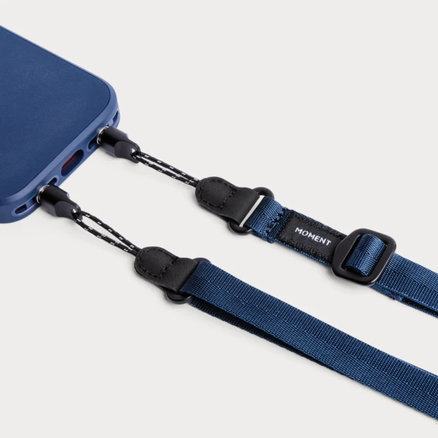 Adjustable phone straps from Moment keep your phone close and secure while taking photos, commuting, or just walking around town. They are made from military-grade nylon webbing and durable aluminum components, making them lightweight, strong, and comfortable to wear. Color: indigo blue.