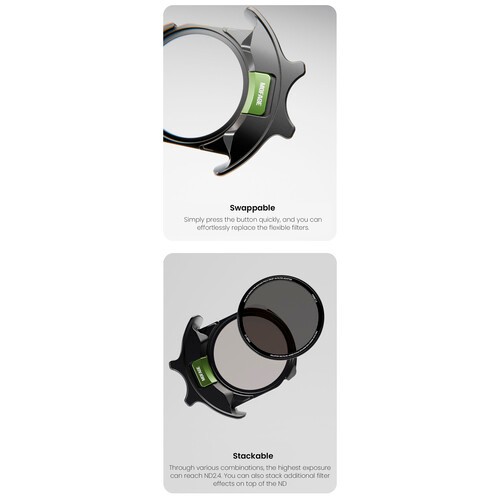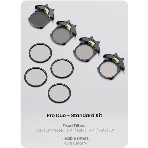 Stackable Versatility: The two-part Pro Duo system allows any of the included Fixed ND filters to be paired with one of the Four Pure Clear Flexible Filters. Furthermore, the filters can be strategically stacked to achieve higher light reduction, reaching up to ND2.4 (8 Stops) with additional 1.2 filters (sold separately or included in the Advanced Kit).