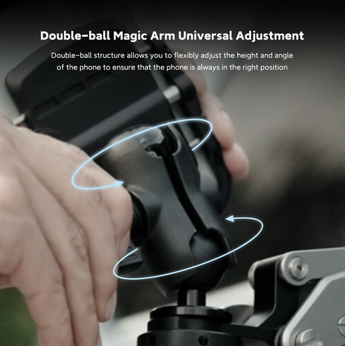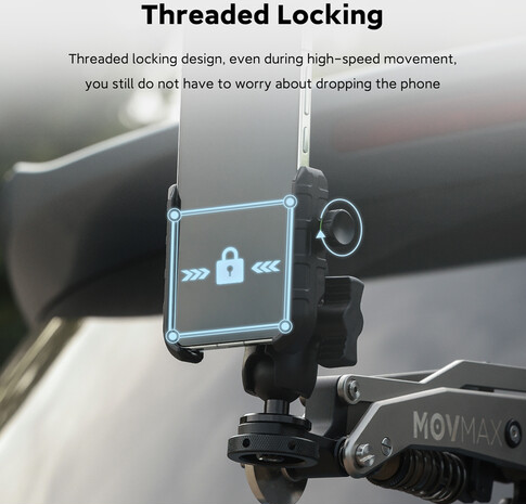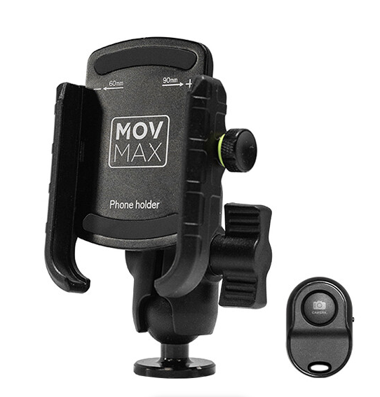 The MOVMAX Smartphone Clamp (86-0039) locks phones from 2.4 to 3.5 inches onto the Blade Arm with a 1/4"-20 ball head for full vertical/horizontal positioning, includes a Bluetooth remote for in-car photo/video triggering, and uses silicone padding to keep devices scratch-free and stable during high-motion vehicle…