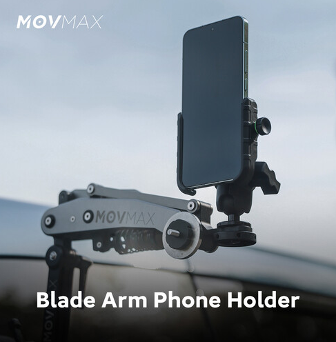 The MOVMAX Smartphone Clamp (86-0039) locks phones from 2.4 to 3.5 inches onto the Blade Arm with a 1/4"-20 ball head for full vertical/horizontal positioning, includes a Bluetooth remote for in-car photo/video triggering, and uses silicone padding to keep devices scratch-free and stable during high-motion vehicle vlogs.