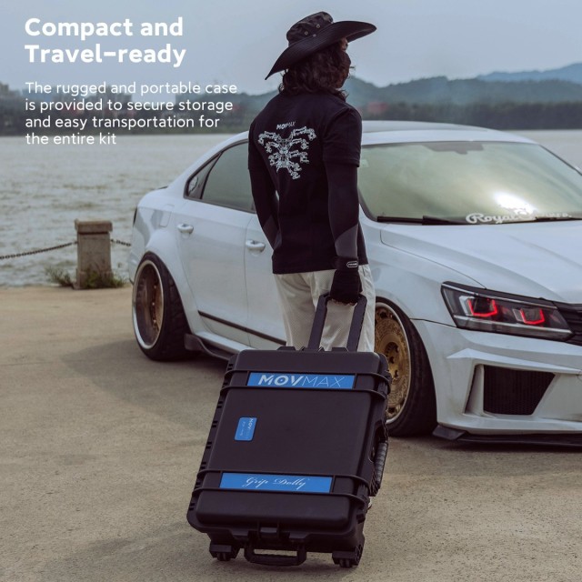 The MOVMAX Grip Dolly Pro Kit is a heavy-duty dolly system with a load capacity of 198 lbs. It includes a flat plate, 75/100/150mm ball adapters, a Mitchell plate adapter, and polymer track wheels for stable movement. The dolly features multiple 1/4"-20 and 3/8"-16 threads, middle and side supports, and comes with a flight case for easy transport and storage.