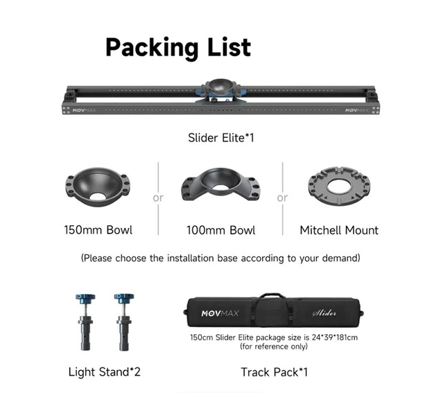 Crafted for precision cinematography, the MOVMAX Slider Elite 70" is a professional linear slider built on 70.8 inches (179.8 cm) of heavy-duty aluminum rails with a friction-driven carriage that delivers whisper-quiet, fluid motion—ideal for dialogue scenes, product reveals, or subtle establishing shots. The integrated tracking platform includes a 150mm bowl mount for secure attachment of industry-standard half-ball fluid heads, handling payloads up to 55.1 lb (25 kg) to accommodate mirrorless, DSLR, or compact cinema rigs with accessories. Two included light stand adapters with 5/8" baby pin receivers enable stable elevation on C-stands or light stands, while the absence of built-in feet maximizes mounting flexibility. Despite its 56 lb packaged weight, the included padded carry case ensures easy mobility for location work. Backed by a limited 1-year warranty, this slider combines silence, strength, and seamless integration for flawless horizontal camera movement in studio or field productions.