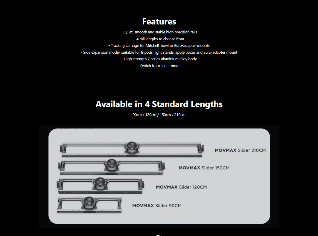 The MOVMAX Slider is a professional-grade cinematography slider designed for smooth, stable, and precise camera movement. Built from high-strength 7-series aluminium alloy, it supports 100mm and 150mm bowl mounts as well as Mitchell mounts, making it adaptable to a wide range of setups. Available in multiple lengths, it offers quiet operation, side expansion capability, and seamless switching from slider mode for maximum versatility on set.