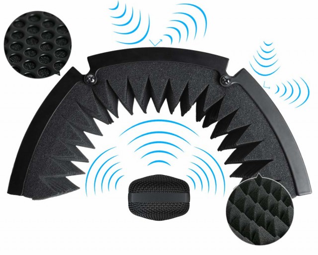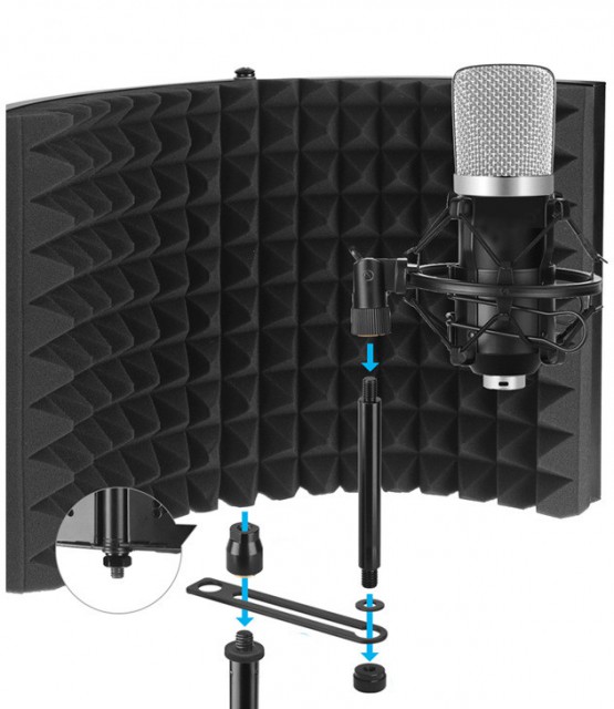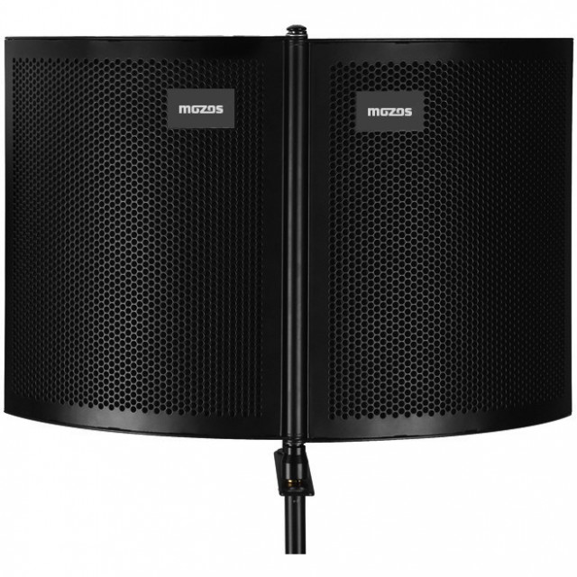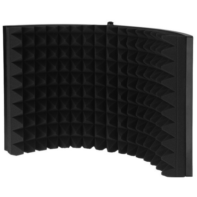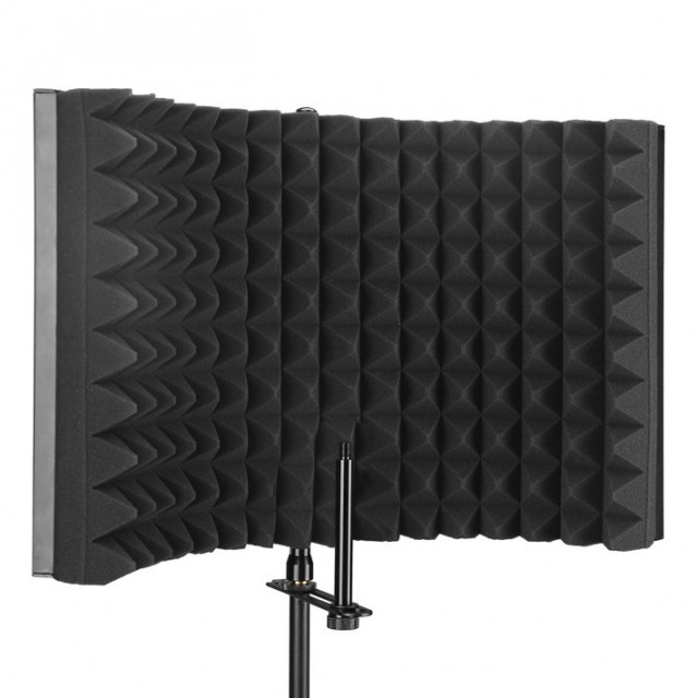 Moses Mshield - acoustic screen to ensure a clear signal without noise. Great for replacing vocals, podcasts, voice-overs, etc. The inner wall is made of high quality noise absorbing acoustic foam, the outer wall is covered by an aluminium structure for safe transport and storage. The screen can be mounted on a microphone stand.