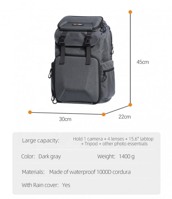 As a professional outdoor camera bag, the capacity is 25L, the upper and lower storage compartments, one camera with multiple lenses, front opening. Hold 1 camera + 4 lenses + 15.6 inch labtop + Tripod + other photo essentials.