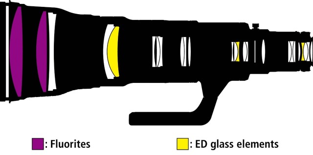 Durable magnesium alloy construction and two fluorite optical elements significantly reduce the weight of the lens and provide better balance, making it easier to handle. The fluorite optical elements offer higher transmission frequencies and lower light scattering than conventional ED glass.