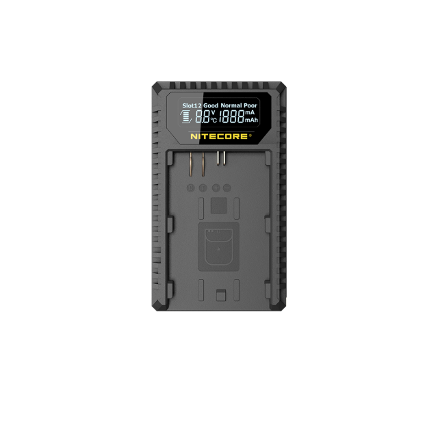 Dual-slot, compact, intelligent USB charger for Canon LP-E batteries compatible with LP-E6/LP-E6N and LP-E8 models. It features an output current of max. 1000 mA (max.), and two slots: Slot 1 (LP-E6/LP-E6N) 8.4V, and Slot 2 (LP-E8) 8.4V. The charger features a reverse-polarity and short-circuit protection, activation process for over-discharged batteries, a display showing battery and charging status, and is compatible with 5V/2A power inputs. 125x70x29 mm, 99,3 g.