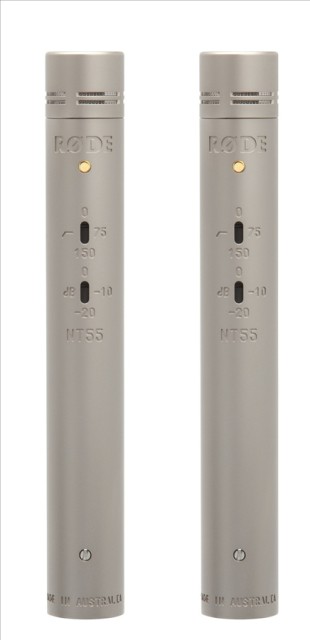 Similar to the RODE NT5 microphone, the RODE NT55 is a small-diaphragm condenser microphone often referred to as a "pencil" microphone. The NT55 is equipped with a 1/2" (slide-on) condenser microphone capsule also used in the RODE NT5 with a cardioid polar pattern. An omnidirectional pattern can be achieved by simply replacing the cartridge with the NT45-O cartridge included in the package.