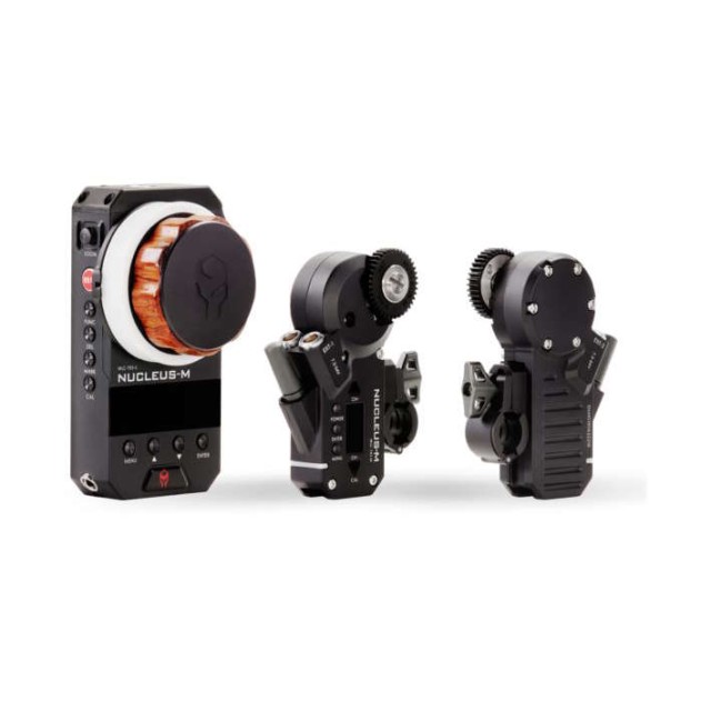 The Nucleus-M wireless motor includes a cine standard 0.8 Mod drive gear and a 19mm rod adapter with a bushing for mounting onto a 15mm rod. The motor features automatic or manual calibration, a display window, and high, medium, and low torque settings.