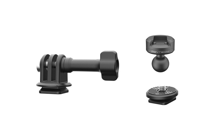 The PGYTECH P-CG-145 CapLock Action Camera Ball-Head Quick Release Set is a compact and versatile mounting solution for action cameras and small accessories. The set includes a ball-head CapLock base, 3-prong action camera adapter, 1/4"-20 screw adapter, and a thumbscrew for quick and secure assembly.