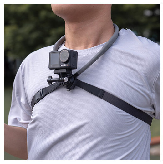The CapLock neck mount features soft, skin-friendly silicone, an adjustable chest strap, and a CapLock quick release system for stability and easy attachment. It supports both horizontal and vertical capture and comes with 3-prong and 1/4"-20 screw adapters for compatibility with most action cameras.