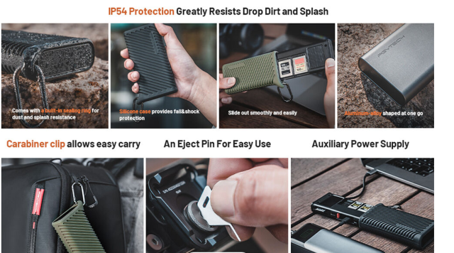 The IP54-rated aluminum case with silicone protection and a sealing ring safeguards against drops, dust, and splashes, while a carabiner allows easy attachment to bags. An auxiliary USB-C power port (5V/2A) ensures stable data transfer. Plug-and-play compatibility extends across Windows, macOS, Linux, Android, and iPadOS devices, making it simple to transfer data from cameras, drones, or action cameras to your devices. Compact, lightweight, and highly durable, this card reader case is a versatile solution for managing your media on the go.