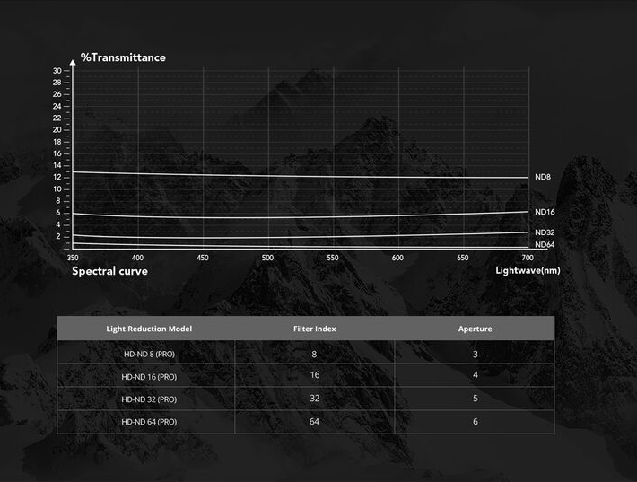Four ND filters: ND8 (3 f-stops), ND16 (4 f-stops), ND32 (5 f-stops), ND64 (6 f-stops)
