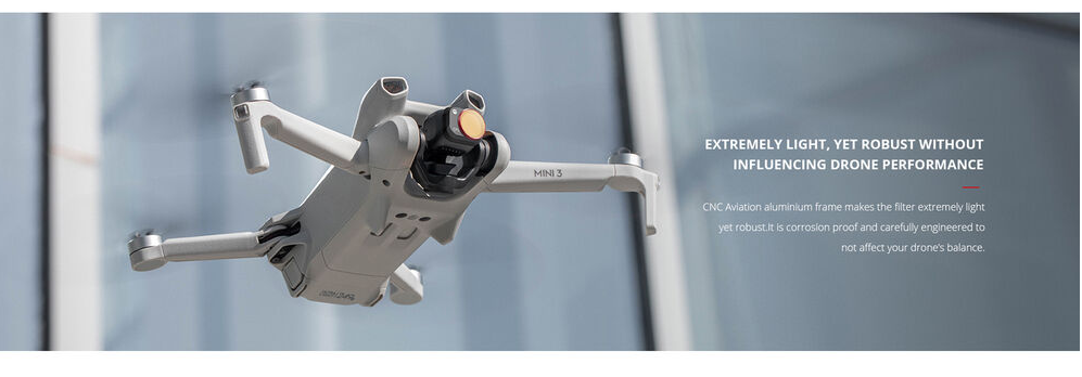 Crafted from double-coated Japanese AGC optical glass, the filter ensures minimal refraction and exceptional optical clarity. The lightweight yet robust CNC aluminum frame is corrosion-proof and engineered to maintain drone balance during flight. Its dual-sided coating makes it waterproof, oil-resistant, and scratch-resistant, providing durability and long-lasting performance. With a light reduction of 1 stop, it allows for controlled exposure in bright conditions.