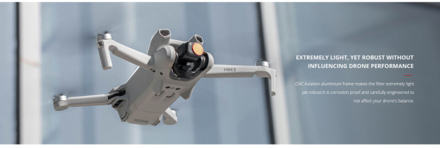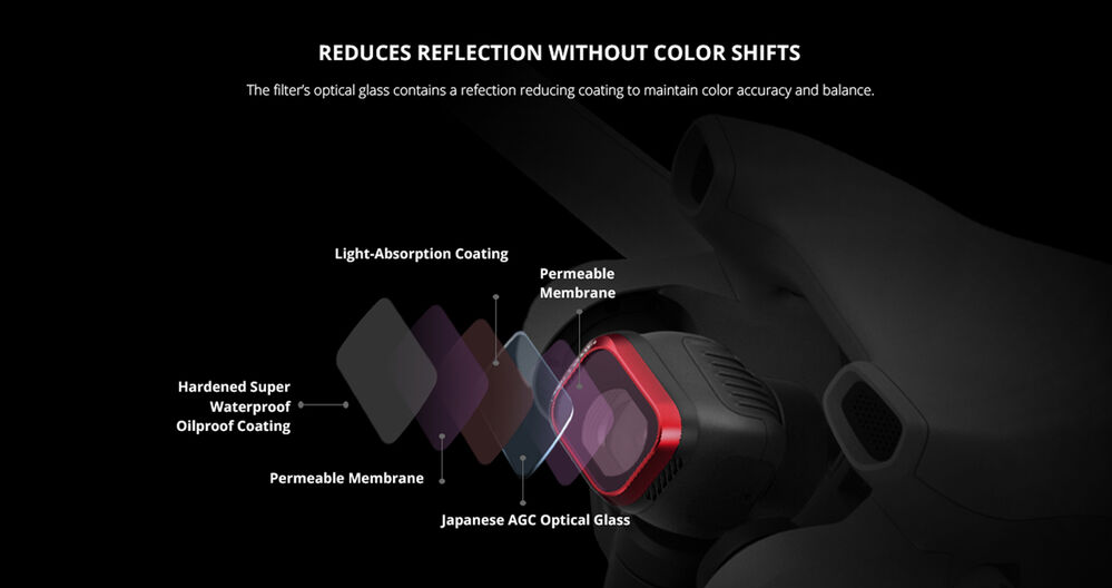 Each filter is crafted from precision-ground Japanese AGC optical glass with a low refractive index to ensure accurate color reproduction and high-definition imaging. Double-sided multi-coatings provide resistance to water, oil, and scratches, making them reliable for outdoor and aerial use. The lightweight yet robust CNC aluminum frame is corrosion-proof and engineered to maintain proper gimbal balance, ensuring stable flight performance.