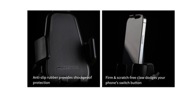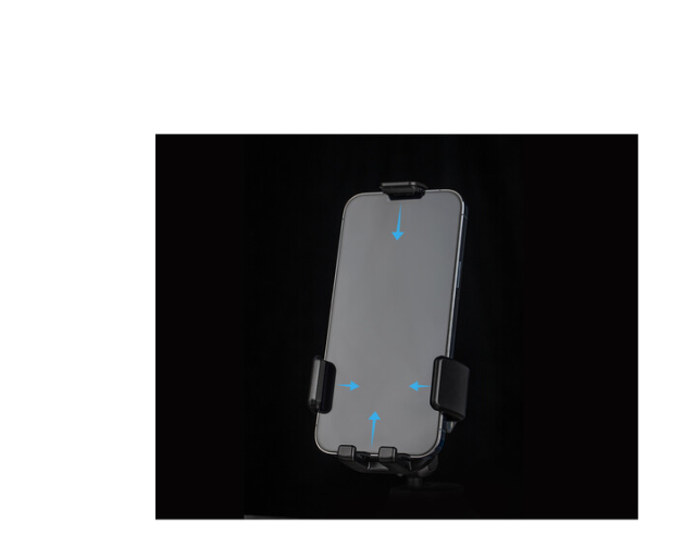 The holder features push-button opening and squeeze-to-close top and side clamps, combined with anti-slip rubber padding and stabilizing feet, ensuring your phone is held securely from all sides. A ball head mount provides 180° tilt and 360° rotation for precise angle adjustment, while the space between the feet accommodates an optional power or data cable. Supporting smartphones up to 10.6 oz / 300 g, this holder combines strength, flexibility, and ease of use.