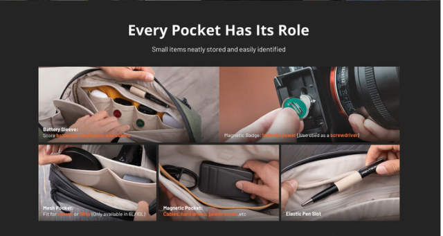 A dedicated rear compartment securely fits a 14" MacBook or 12.9" iPad Pro, while multiple interior pockets accommodate batteries, cables, filters, power banks, hard drives, and other tech accessories. The front quick-access compartment is ideal for personal items like your phone, keys, or wallet.