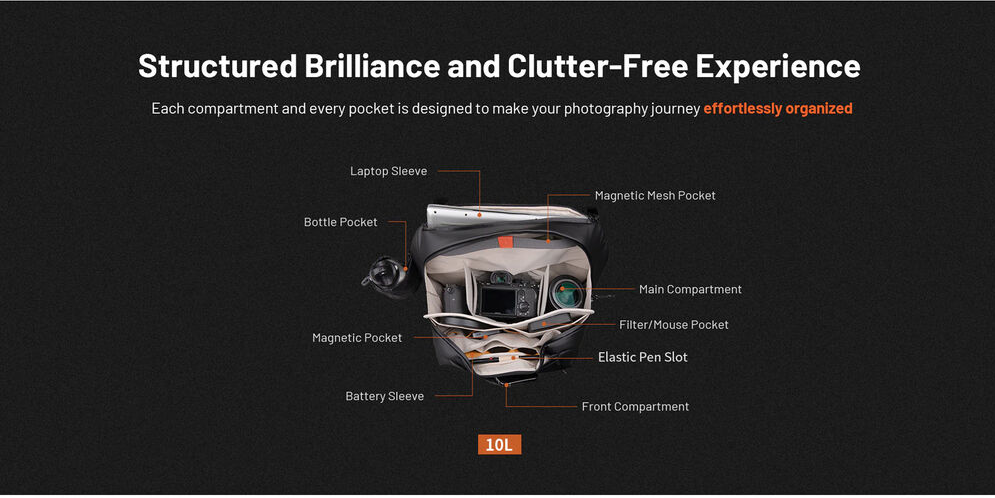 The PGYTECH OneGo Solo Sling Bag V2 (10L) is a sleek, anti-theft camera sling designed to carry one camera, up to three lenses, and a laptop or tablet. Featuring YKK zippers, adjustable padded strap, splash-resistant fabric, and smart interior organization, it’s ideal for everyday photography and travel.