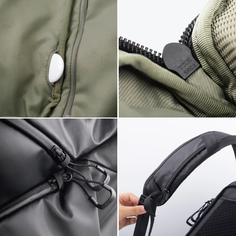 In addition, the backpack has a hidden pocket for AirTag, battery pockets, and a roll-top closure with buckles for added security. The exterior of the backpack is made of water-resistant polyester and features high-quality YKK zippers for durability and reliable protection of your belongings.