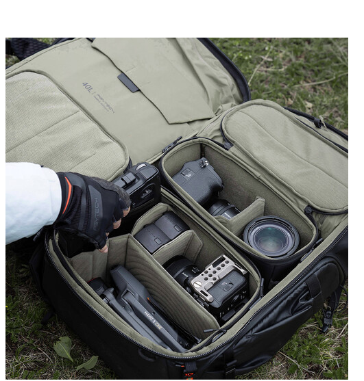 Constructed with PU-coated Cordura material, the backpack is water-resistant and resistant to wear and tear. The aviation aluminum 3D arch frame provides structure and stability, while the 3D contoured shoulder and waist straps, along with the ergonomic air mesh back panel, ensure comfortable carrying for long periods. Quick side access and side water bottle pockets add convenience during shoots, and the 4-stage adjustable back length allows a custom fit for different body types.