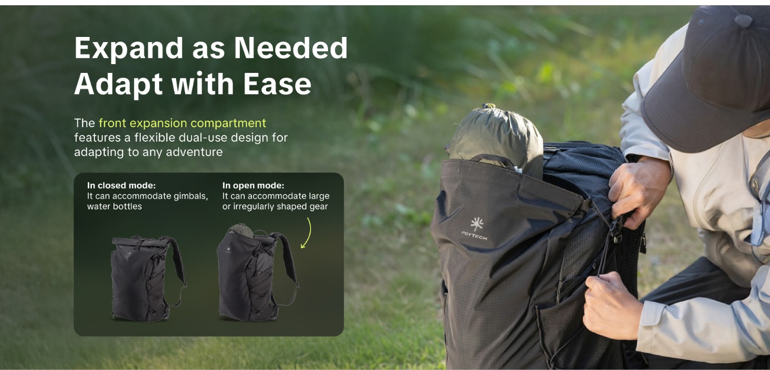 The front expansion compartment features a flexible dual-use design for adapting to any adventure.