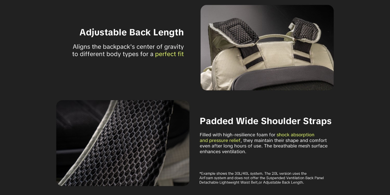 Aligns the backpack's center of gravity to different body types for a perfect fit.