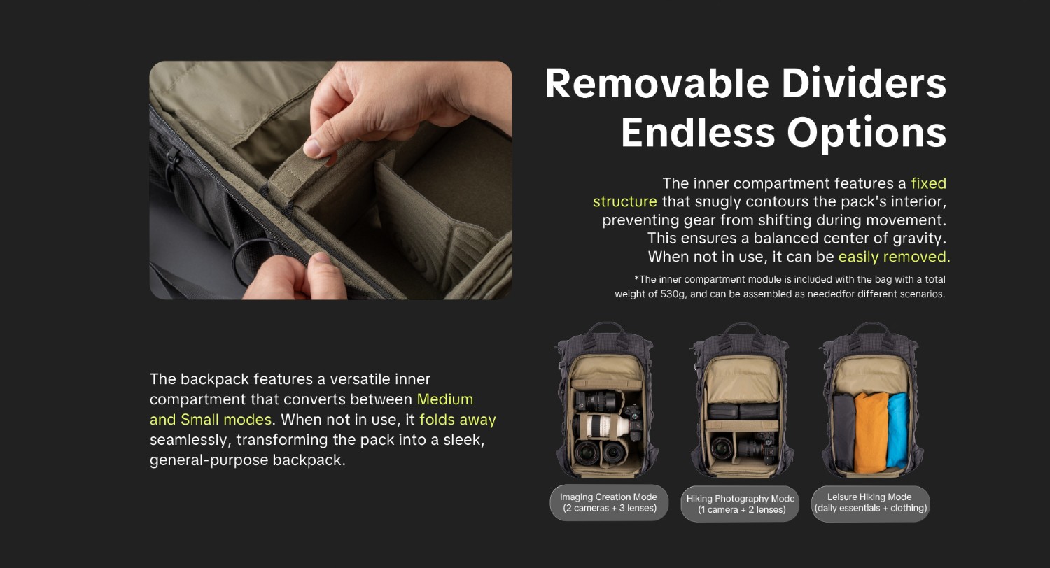 The backpack comes with a standard dual-use inner compartment (switchable between Medium and Small configurations). When not needed, it can be folded away, instantly converting the main pack into a general-purpose outdoor backpack.
