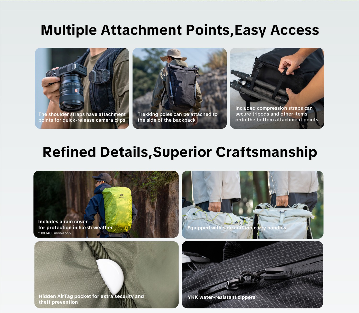 The backpack comes with a standard dual-use inner compartment (switchable between Medium and Small configurations). When not needed, it can be folded away, instantly converting the main pack into a general-purpose outdoor backpack.