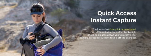 The innovative side quick-access panel, a key differentiator from other lightweight photo backpacks, allows you to retrieve your camera in seconds without taking off the backpack.