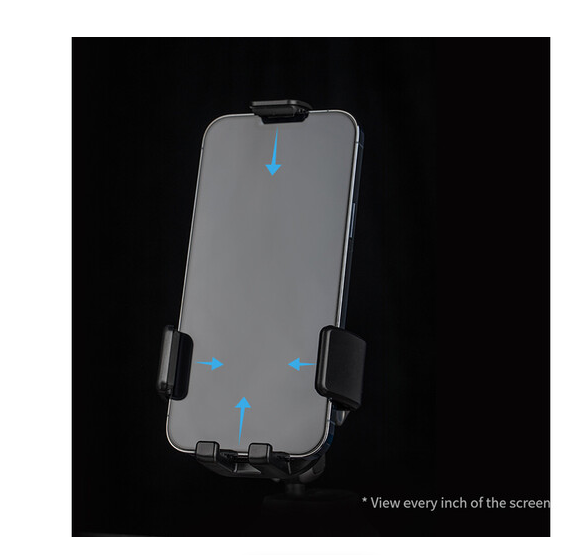 The full wrap phone holder secures your device with anti-slip rubberized feet, side arms, and a top clamp, ensuring your phone stays firmly in place. A locking dual ball head magic arm allows 180° tilt and 360° rotation, giving you complete control over viewing angles. The push-button quick release enables easy one-handed phone insertion and removal, while a port cutout allows charging or data cables to remain connected during use.