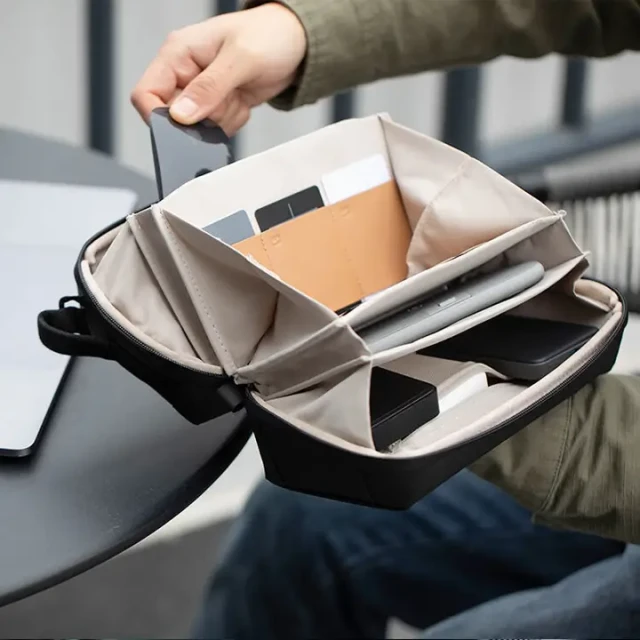 The practical clamshell opening allows you to easily access the contents, whether you open the case partially or completely. Inside, you will find a well-designed system of pockets and elastic loops that will keep your cables, chargers, headphones, power banks, pens, and other small accessories safe and tidy.