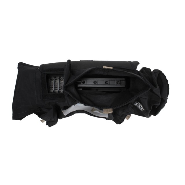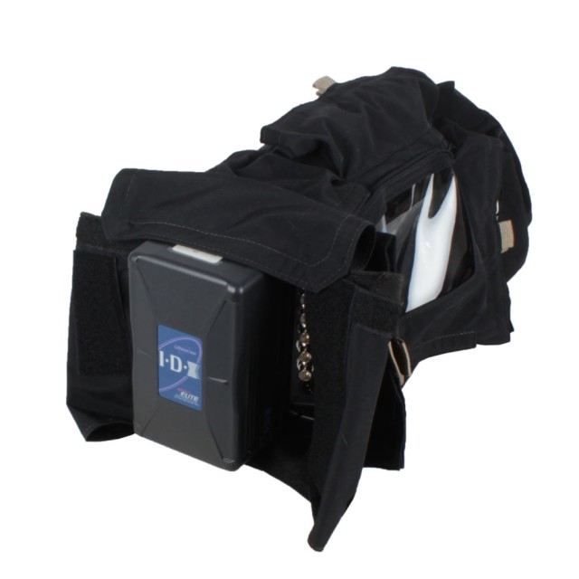 Clear Vinyl windows are used to provide unobstructed visibility of camera controls and the viewfinder. Velcro-sealed openings are carefully placed to provide full access to controls and power supply without allowing water to seep in. The adjustable lens gasket creates a tight seal around a wide range of lens sizes, including cinema lenses and matte boxes. The waterproof material that forms the cover around the lens also adjusts to accomodate different lens lengths.