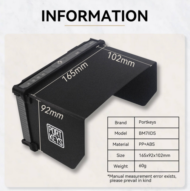 The Portkeys BM7IIDS is a lightweight, foldable sunshade designed specifically for the BM7 II DS monitor, crafted from durable PP+ABS material and weighing just 60g with dimensions of 165x92x102mm, providing effective glare reduction in bright shooting environments while maintaining portability and easy attachment…