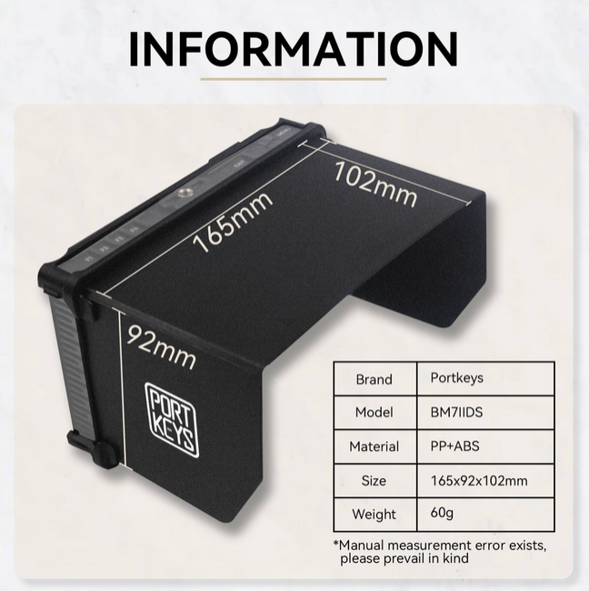 The Portkeys BM7IIDS is a lightweight, foldable sunshade designed specifically for the BM7 II DS monitor, crafted from durable PP+ABS material and weighing just 60g with dimensions of 165x92x102mm, providing effective glare reduction in bright shooting environments while maintaining portability and easy attachment.
