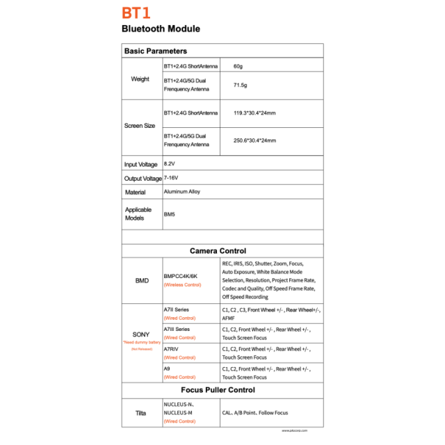 Sony A7II / A7III / A7IV series : Wired control Sony A7II / A7III / A7IV series cameras via connecting BT1 on BM5. Control cable with dummy battery which will be ready later month need to be purchased separately.