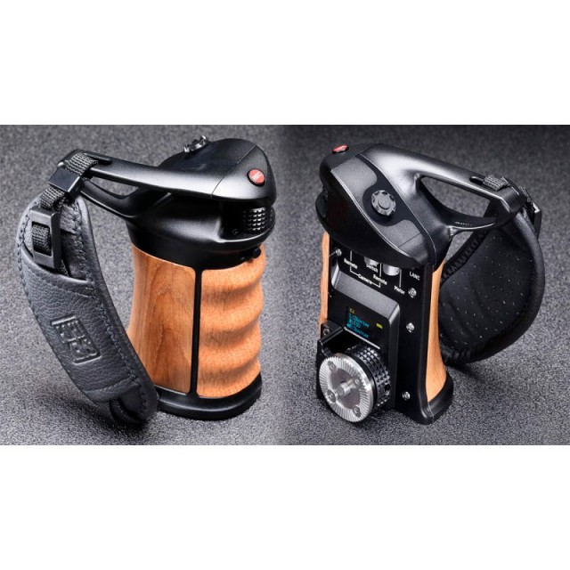 This is the perfect low delay wireless setup with the Blackmagic Pocket 4K/6K as it controls and navigates smoothly and quickly using Bluetooth. Other cameras can benefit from the Keygrip via LANC cables also. The Keygrip is made of a premium Aerometal frame with a Red oak handle and an artificial leather strap, making it very comfortable for long usage.