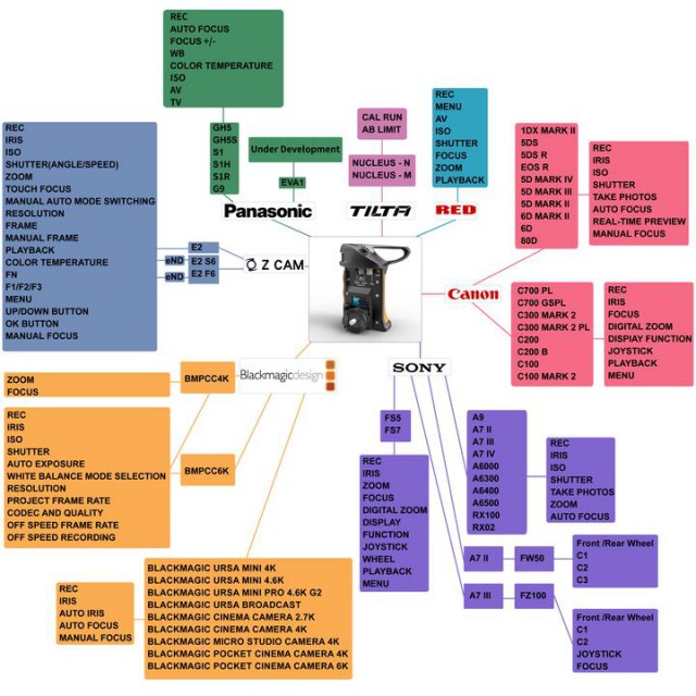 Wired control for REC, IRIS, ISO, SHUTTER (angle/speed), ZOOM, TOUCH FOCUS, Manual to AUTO MODE SWITCHING, RESOLUTION FRAME,Manual FRAME and PLAYBACK features for the E2, E2 S6, E2 F6 camersa.