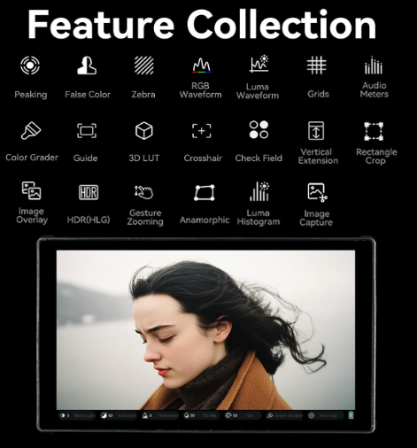 Beyond monitoring, the LH5C excels as a comprehensive toolkit with features like Freeze Frame with Overlay Comparison, allowing users to capture reference frames on a USB drive and overlay them semi-transparently over live video for seamless shot continuity, actor positioning, or complex composition recreation—ideal for narrative filmmaking or commercial shoots. It supports up to 20 custom 3D LUTs with real-time HDMI output for on-the-fly color grading, alongside essential tools such as waveform monitors, histograms, audio meters, customizable focus peaking, zebra patterns, and ARRI False Color for exposure precision. Additional pro features include anamorphic de-squeeze (10 presets plus custom 0.25X-4.00X ratios), rectangle cropping, crosshair overlays, and framing grids to streamline anamorphic and aspect ratio workflows. Input flexibility covers 4K30p lossless signals with 1080p60 output via HDMI, while the 3.5mm headphone jack provides audio monitoring. Mounting is effortless with multiple 1/4"-20 screw holes on the bottom and sides, supporting vertical shooting and integration into rigs, gimbals, or tripods. Power options include USB-C at 5V or Sony NP-F batteries (7-24V input; battery not included), making it versatile for extended shoots without relying on mains power.