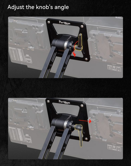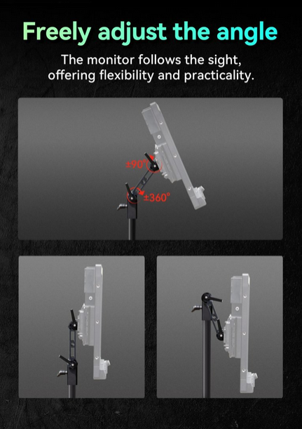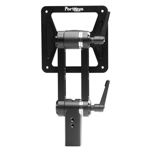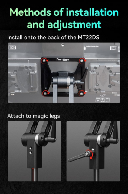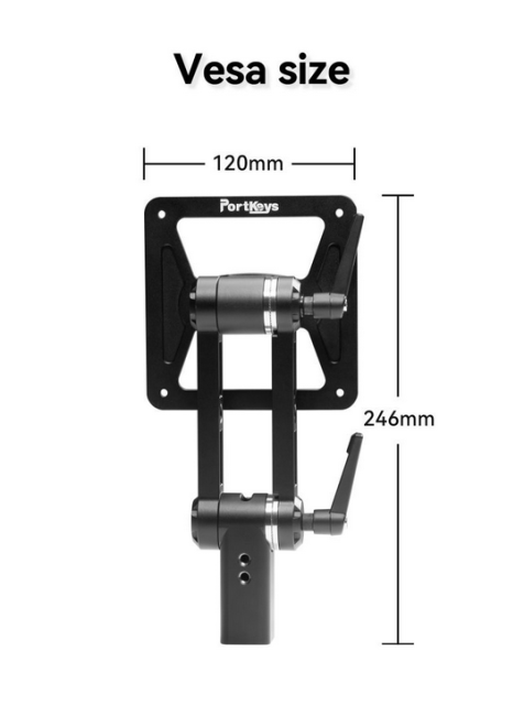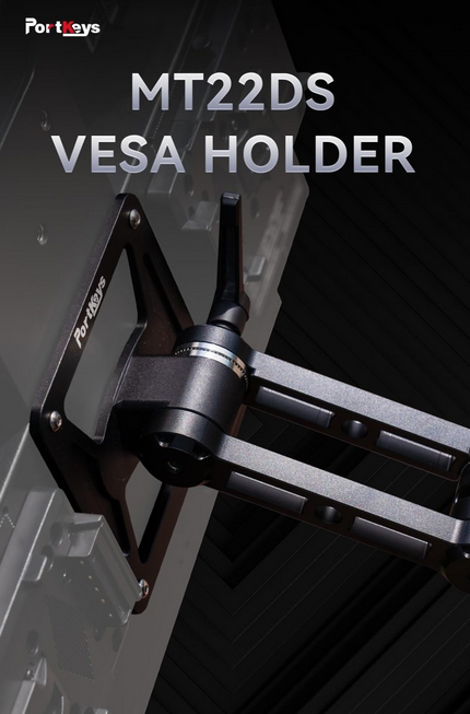 The Portkeys MT22DS VESA Holder provides a robust and adjustable mounting solution tailored for the MT22DS monitor. It enables users to freely adjust the angle so the monitor follows the sight, delivering flexibility and practicality in any setup. The holder supports 90° tilt and 360° rotation for precise positioning. Installation is straightforward with two methods: attach directly onto the back of the MT22DS using included mounting points or connect to magic legs for extended reach and stability. The VESA-compatible design measures 120mm horizontally and 246mm vertically, ensuring compatibility with standard monitor arms and rigs.